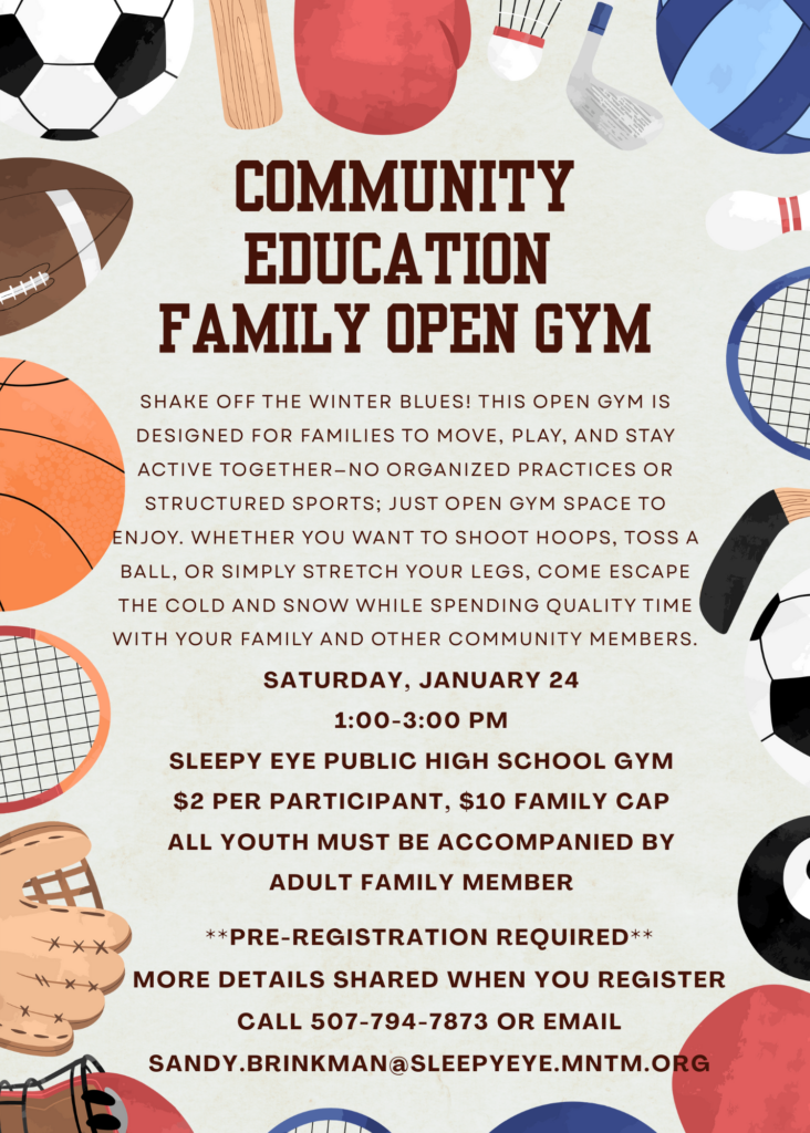 The Community Education Family Open Gym is the perfect chance for families to get moving, play together, and enjoy some indoor fun—no structured practices, just open space to play! Whether you want to shoot some hoops or just let the kids burn off some energy, we’d love to see you there.